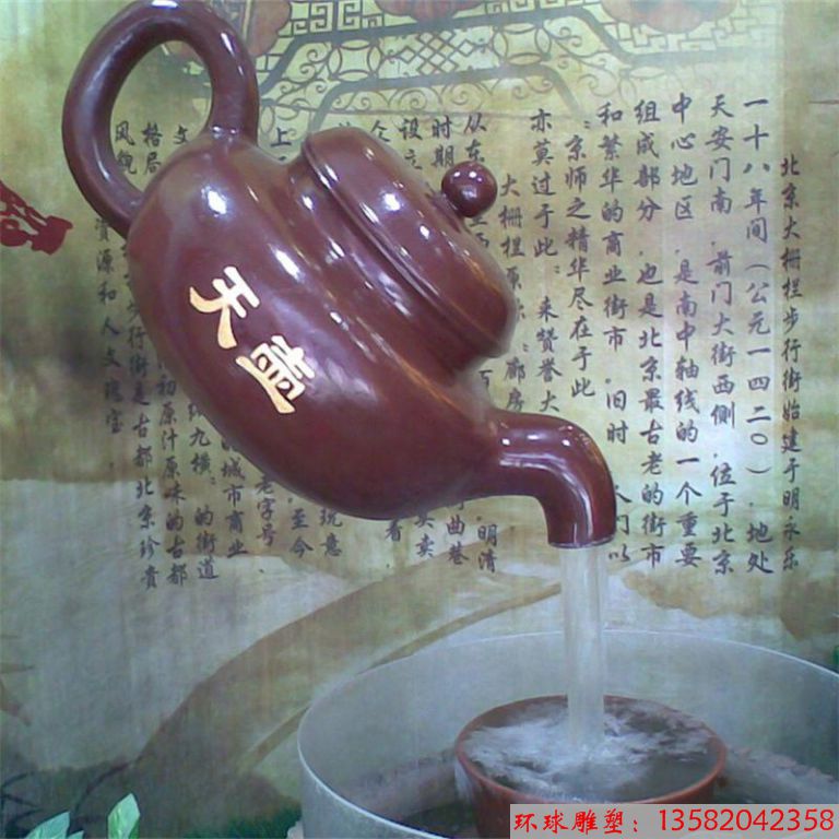 玻璃钢天壶雕塑流水的原理是:在天壶水柱的中间有根管,起到支撑作用,用水泵将水从管子里吸上去,再从管子的外壁上流下来 ,给人的错觉就是水源源不断的流出。